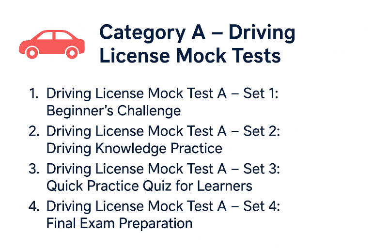 Driving License Mock Test A – Set 1: Beginner’s Challenge Driving License Mock Test A – Set 2: Driving Knowledge Practice Driving License Mock Test A – Set 3: Quick Practice Quiz for Learners Driving License Mock Test A –…