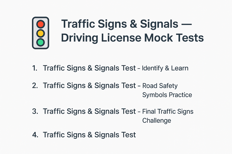 Traffic Signs & Signals Test – Set 1: Identify & Learn Traffic Signs & Signals Test – Set 2: Road Safety Symbols Practice Traffic Signs & Signals Test – Set 3: Final Traffic Signs Challenge